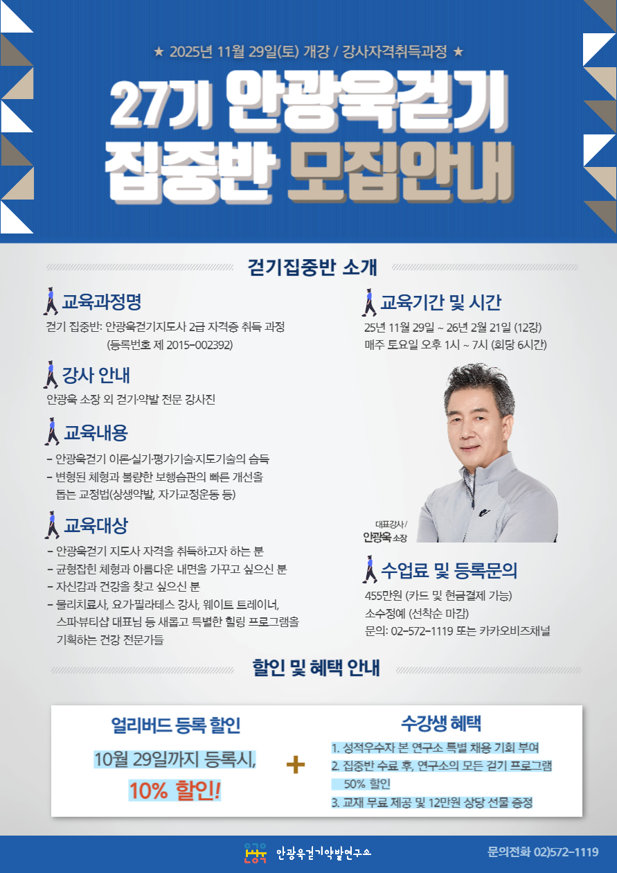 ¾È±¤¿í°È±âÁýÁß¹ÝÀº 12ÁÖ ±â°£ µ¿¾È Çѱ¹ÀÎÀÇ Æ¯¼ºÀ» ¹ÙÅÁÀ¸·Î °³°³ÀÎÀÇ Ã¼Çü¿¡ ¾Ë¸ÂÀº ¹Ù¸£°Ô °È±â¸¦ ±³À°ÇÏ´Â °úÁ¤ÀÔ´Ï´Ù. °È±âÀÇ À̷аú ½Ç±â¸¦ ±âÃʺÎÅÍ ½ÉȰúÁ¤±îÁö Àü °úÁ¤ ¾È±¤¿í ¼ÒÀå´Ô²²¼ Á÷Á¢ °ÀÇÇϽøç, ÇÁ·Î±×·¥ À̸§ ±×´ë·Î ´Ü±â°£ ÁýÁßÀûÀ¸·Î À߸øµÇ¾îÀÖ´ø ÀÚ¼¼¸¦ ±³Á¤ÇÏ´Â ¹æ¹ýÀ» ¹è¿ì°í ¿Ã¹Ù¸¥ º¸Çà½À°üÀ» ÀÍÈ÷´Â °úÁ¤À̶ó ÇÒ ¼ö ÀÖ½À´Ï´Ù.